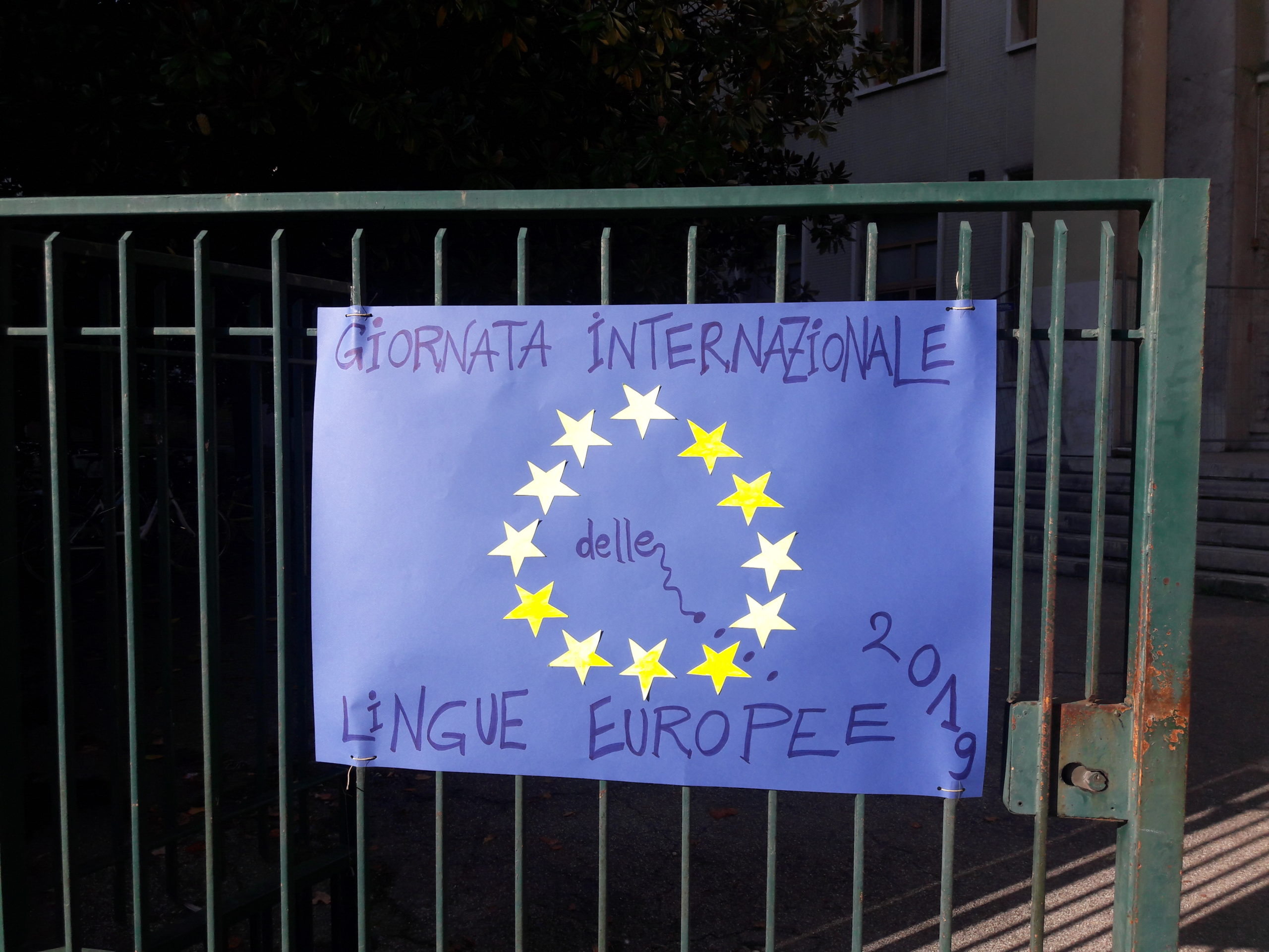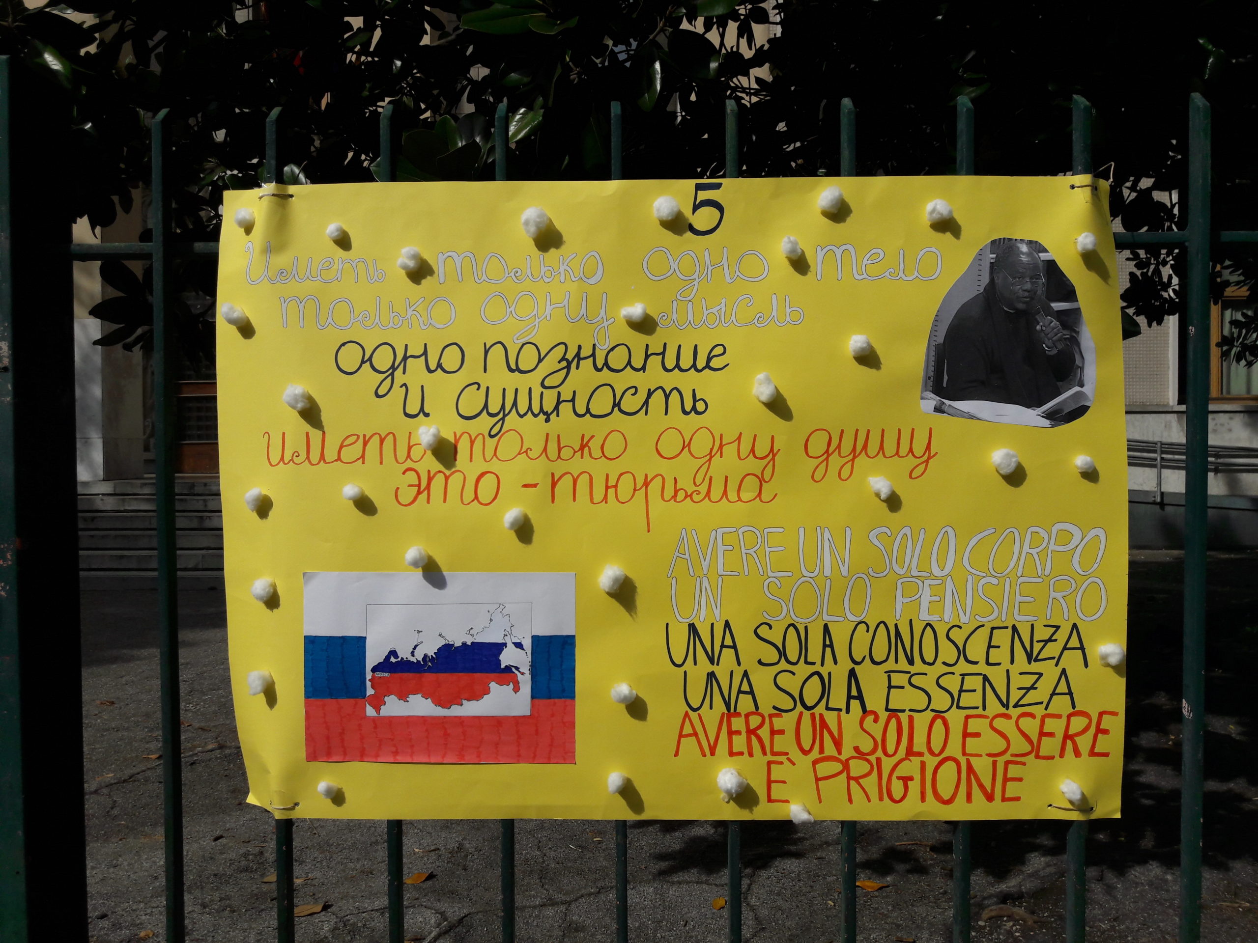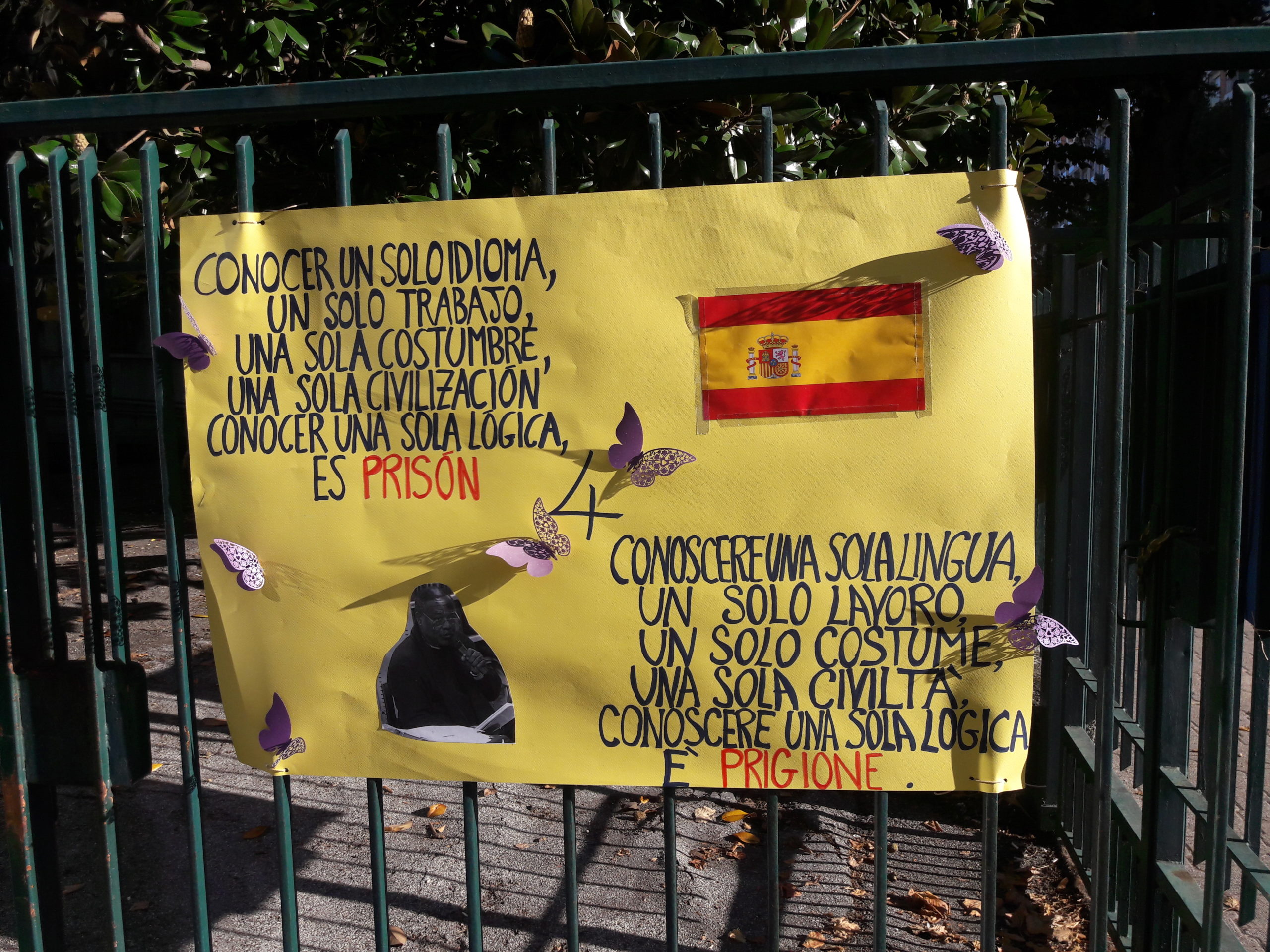 Innanzitutto, bisogna dire che questo è stato il primo di quella che speriamo essere una lunga serie. Come forma per dare visibilità all’evento, abbiamo scelto quella del flash mob nel cortile antistante la scuola, sulle note di una canzone spagnola molto famosa che ben si prestava a essere cantata da tutti, oltre a quelle della famosissima Imagine dei Beatles, il cui messaggio è evidente e noto a tutti: perché siamo davvero convinti che la conoscenza delle lingue straniere aiuti ad abbattere i confini e ad andare incontro a tutte le diversità, di qualsiasi tipo esse siano. Abbiamo poi riempito le cancellate con cartelloni gialli e azzurri (i colori della bandiera dell’UE), con il testo della poesia Mok di Ndjock Ngana, in tutte le lingue da noi studiate (inglese, francese, spagnolo, tedesco, cinese, giapponese e russo), comprese quelle classiche, a significare che è solo la stretta simbiosi fra passato e presente a rendere solido il nostro futuro.